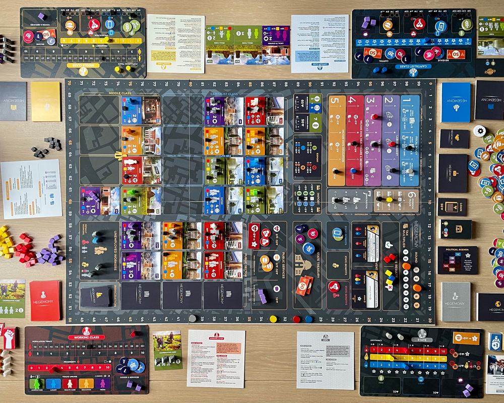 1399 Kč | Hegemony je naučná politicko-ekonomická desková hra, ve které hrajete za jednu ze čtyř ekonomických tříd (pracující, kapitalisty, střední třídu a stát samotný) a snažíte se co možná nejlépe hájit jejich zájem. Pracující třída ovládá pracovníky, kapitalisté společnosti, střední třída kombinuje obojí z předchozích dvou jmenovaných a stát se snaží udržet všechny spokojené a prostřednictvím daní zajistit pozitivní rozpočet. Každá třída má své vlastní cíle, ale všechny jsou omezené opatřeními, jenž regulují veškeré akce. Právě volbou těchto opatření a jejich využití jste nejvíce schopni ovlivňovat průběh celé hry, zajistit sílu vaší třídy a dovést ji k vítězství.